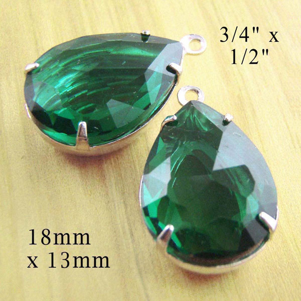 These emerald green faceted glass pears are 18mm x 13mm – that’s approximately 3/4″ x 1/2″. This is a fabulous size for earring jewels – and lovely for pendants. Not too large, not too small. These stones are great used just as is – or used as components in complex pendants or earring designs. Hand set in golden raw brass, antique patina brass, or silver plated brass settings – in one ring or two ring styles. These are definitely a customer favorite in my shop!