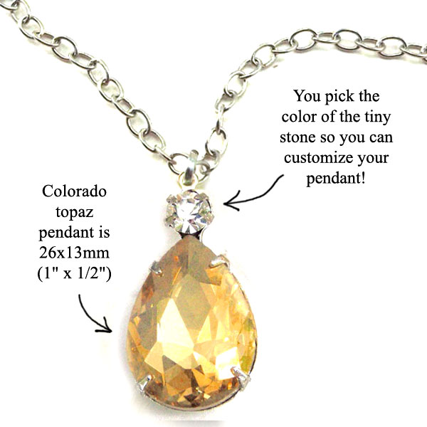 The jewel (multi stone) is 26mm x 13mm – that’s approximately one inch high. The teardrop shape here is what’s called “colorado topaz” – a light golden tan. And you pick the small round stone at the top of the setting – so it’s easy to customize these. Her favorite outfit is an aqua sweater with a tan skirt? Pick aqua blue for the tiny stones here! You get the idea. Customize the jewels – and make an easy to use, easy to wear pendant!