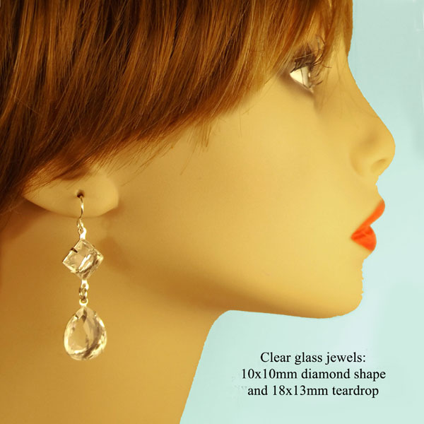 The mannequin in this pic is close to life size, so you can see the scale of these sparkling, clear glass jewels. I used good lighting taking this pic – but it wasn’t unnaturally bright or anything. Walk into a well lit room and this is what your clear jewelry looks like! Combine these clear 10x10mm diamond shape stones, and 14x10mm pear shaped teardrops – or try your own combination of stones in your own creative style.