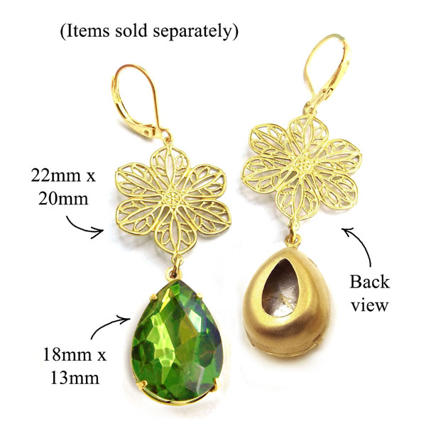 A lot of times I just work with faceted glass stones – but I found these gorgeous golden brass filigree flowers a while back (I’ve featured them a time or two I think!) and I just had to play with them again. This time I added glass pears in olivine green – somehow that seemed especially Spring-like. Hey, it’s really cold outside – I mean, this is January – and Spring just sounds inviting!