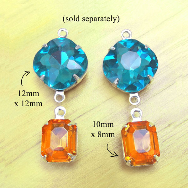 I just wanted to show an example of unusual(ish) color combinations – and show how good they look together! Case in point, the orange octagons I mentioned recently are paired here with deep aqua blue cushion cut glass octagons.